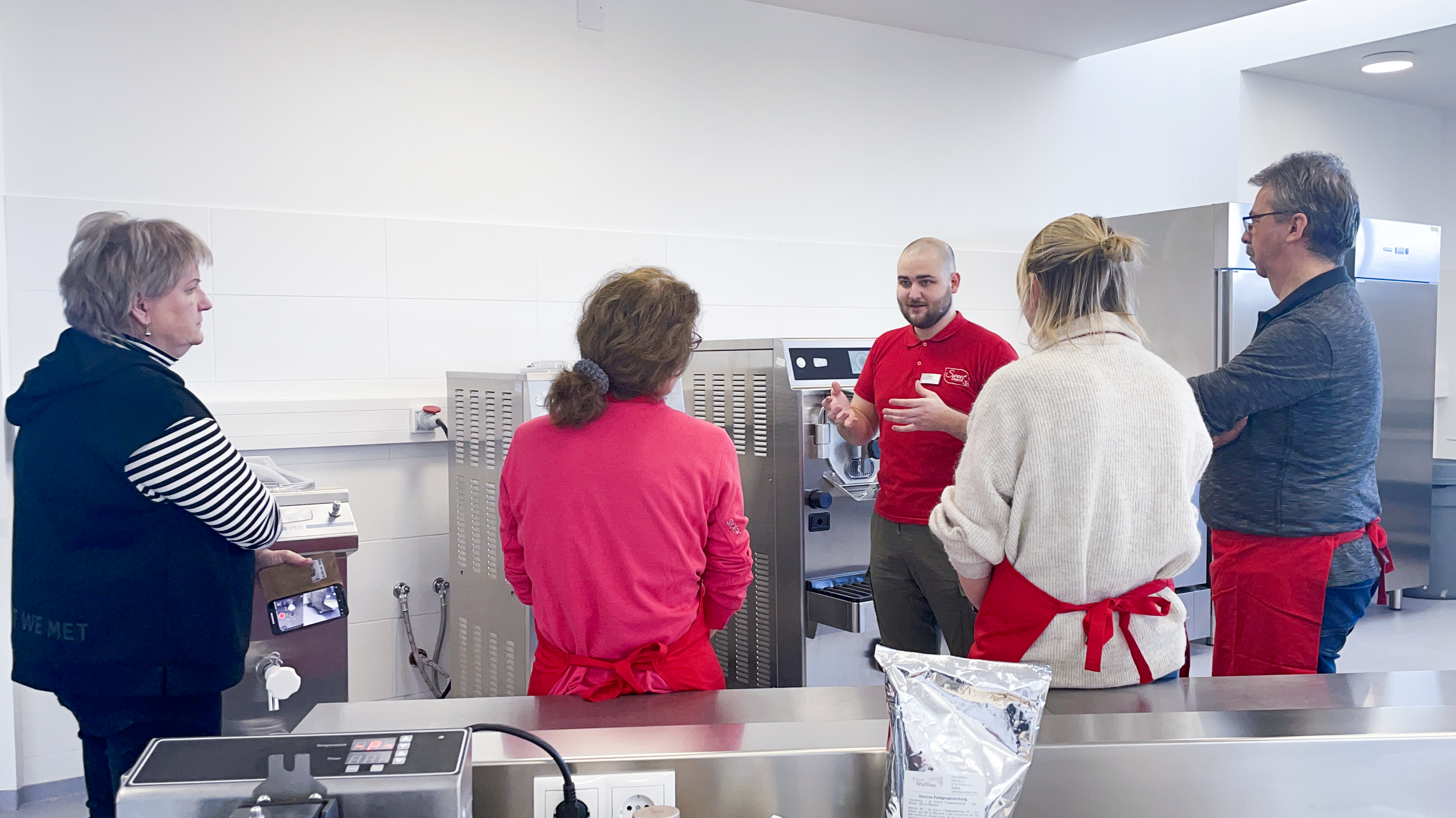 Die Teilnehmer werden in sämtlichen erforderlichen Arbeitsabläufen einer Eisdiele geschult, einschließlich des Einkaufs, der Produktion, Lagerung, Präsentation und Verkauf von Eis.