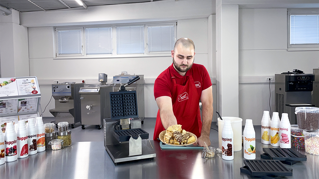 Auch Crêpes werden wir hier zubereiten und mit frischen Zutaten und Saucen anrichten. Die beiden Süßigkeiten lassen sich hervorragend mit Speise- oder Softeis kombinieren und sind so eine tolle Erweiterung für Eisdielen, Restaurants oder Hotels, die eine einzigartige Nachspeise bieten wollen.