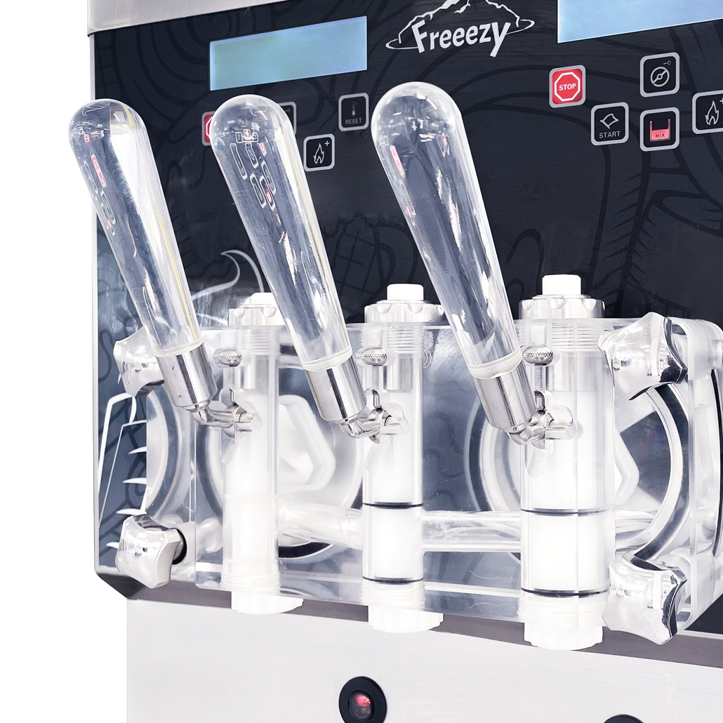 Die hochwertige Freeezy Softeismaschine Profi Triple (gebraucht) ist eine Profi-Maschine, die für große Mengen konzipiert wurde. Damit produzieren Sie bis zu 80 Liter köstliches Softeis pro Stunde.