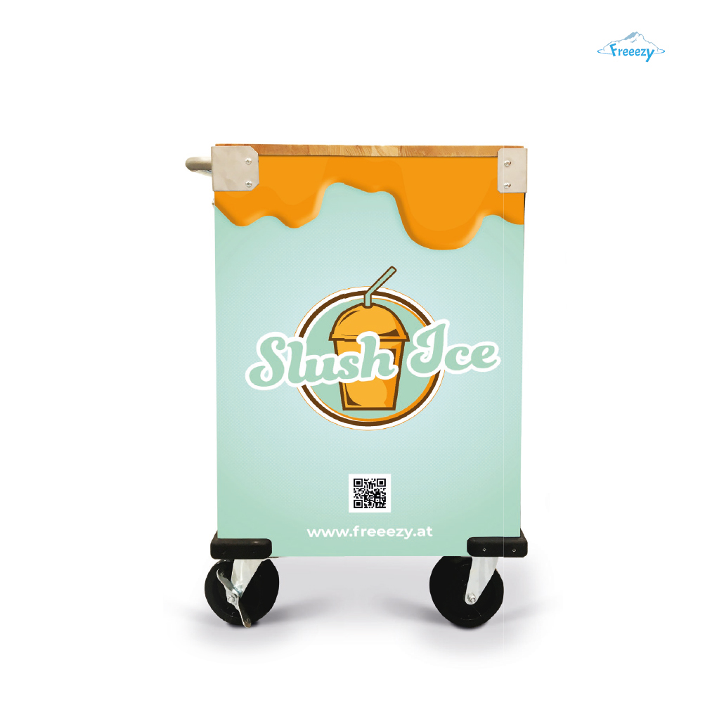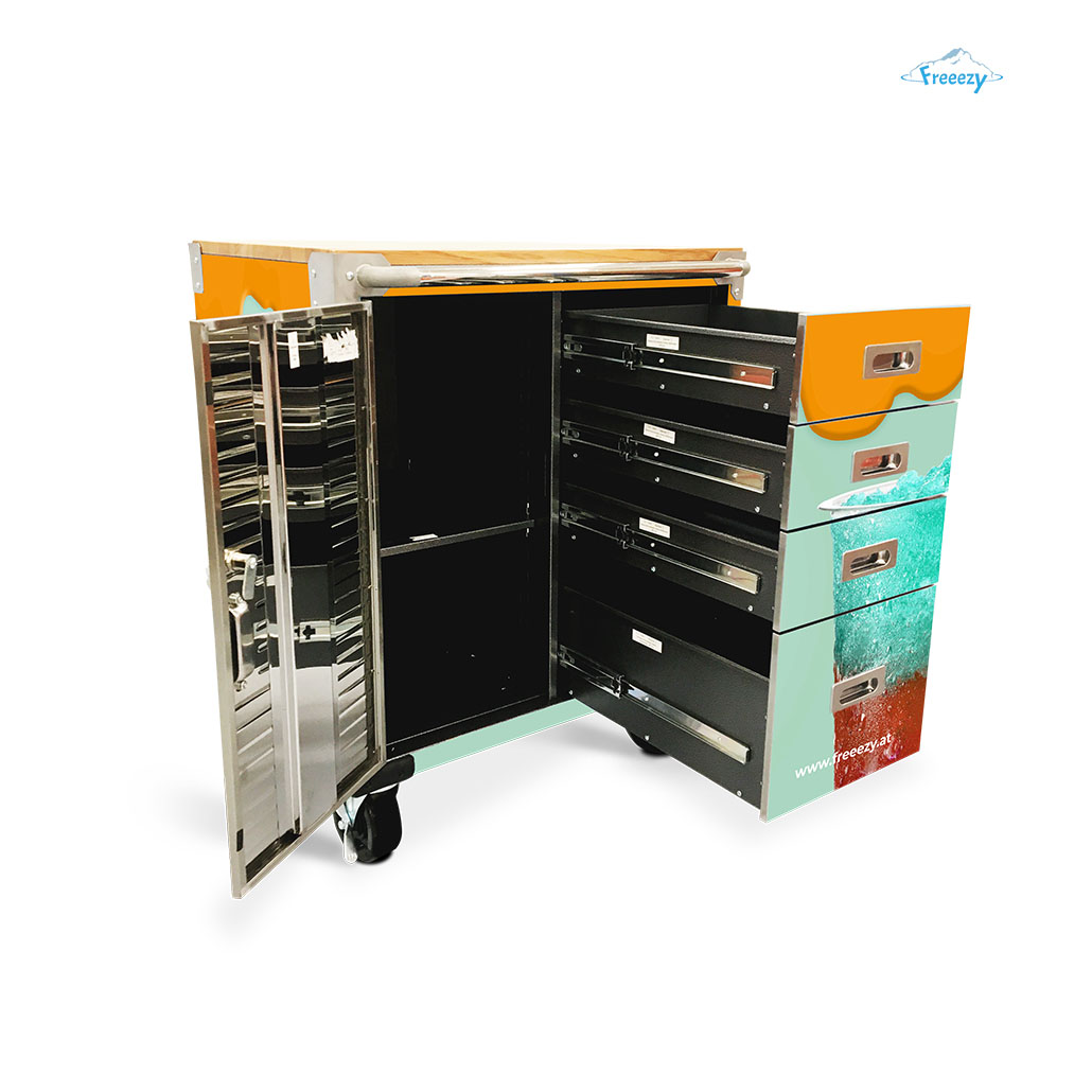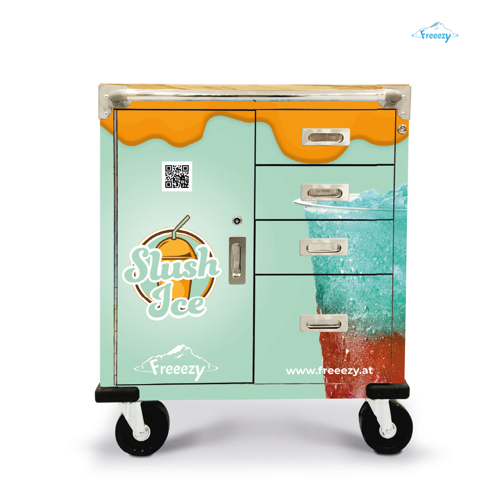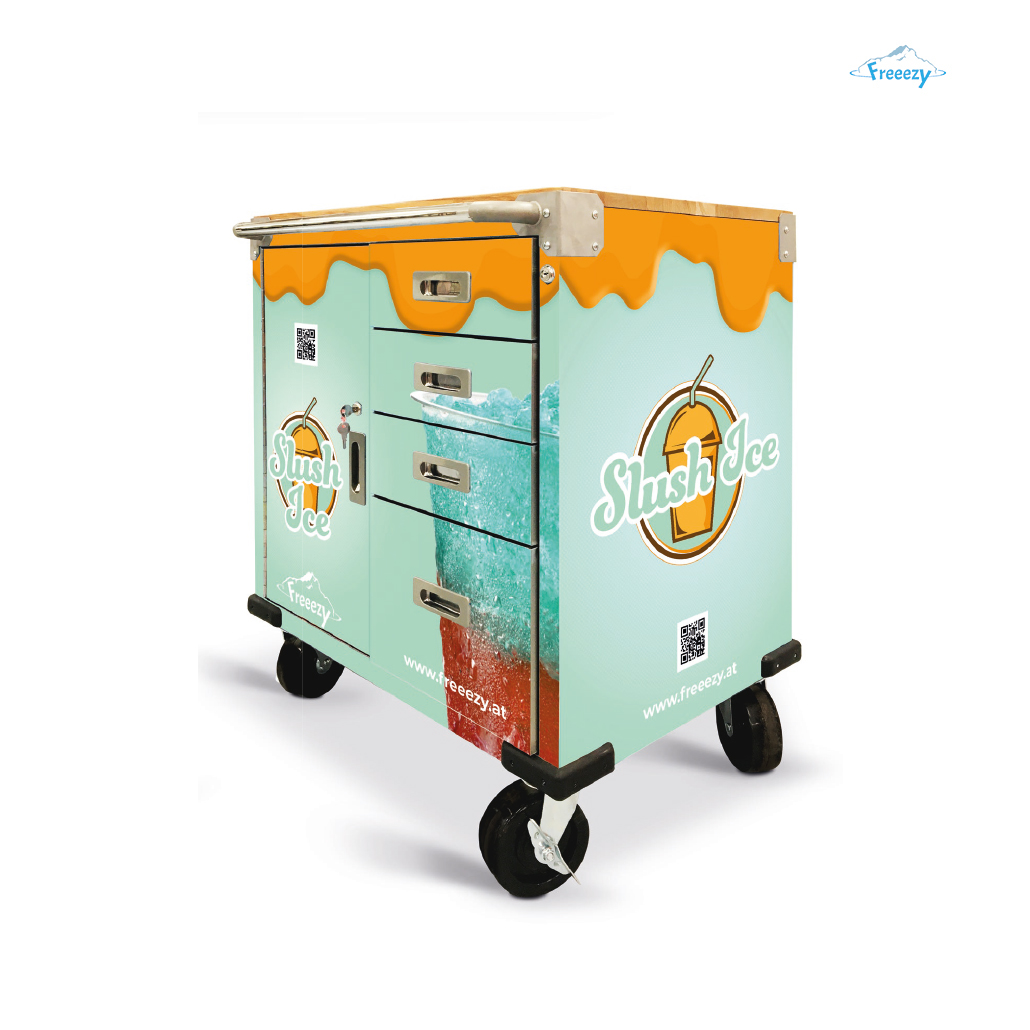 Der Freeezy Slush Ice Tisch für jede Veranstaltung: Lagern Sie Ihre Waren sicher und komfortabel in den praktischen Fächern und platzieren Sie ein beliebiges Standgerät. Der bewegliche Tisch ist im schicken Freeezy-Design gebrandet und bietet viel Platz für Produktion und Verkauf von Eiscreme, Softeis, Waffeln, Crêpes und vieles mehr.