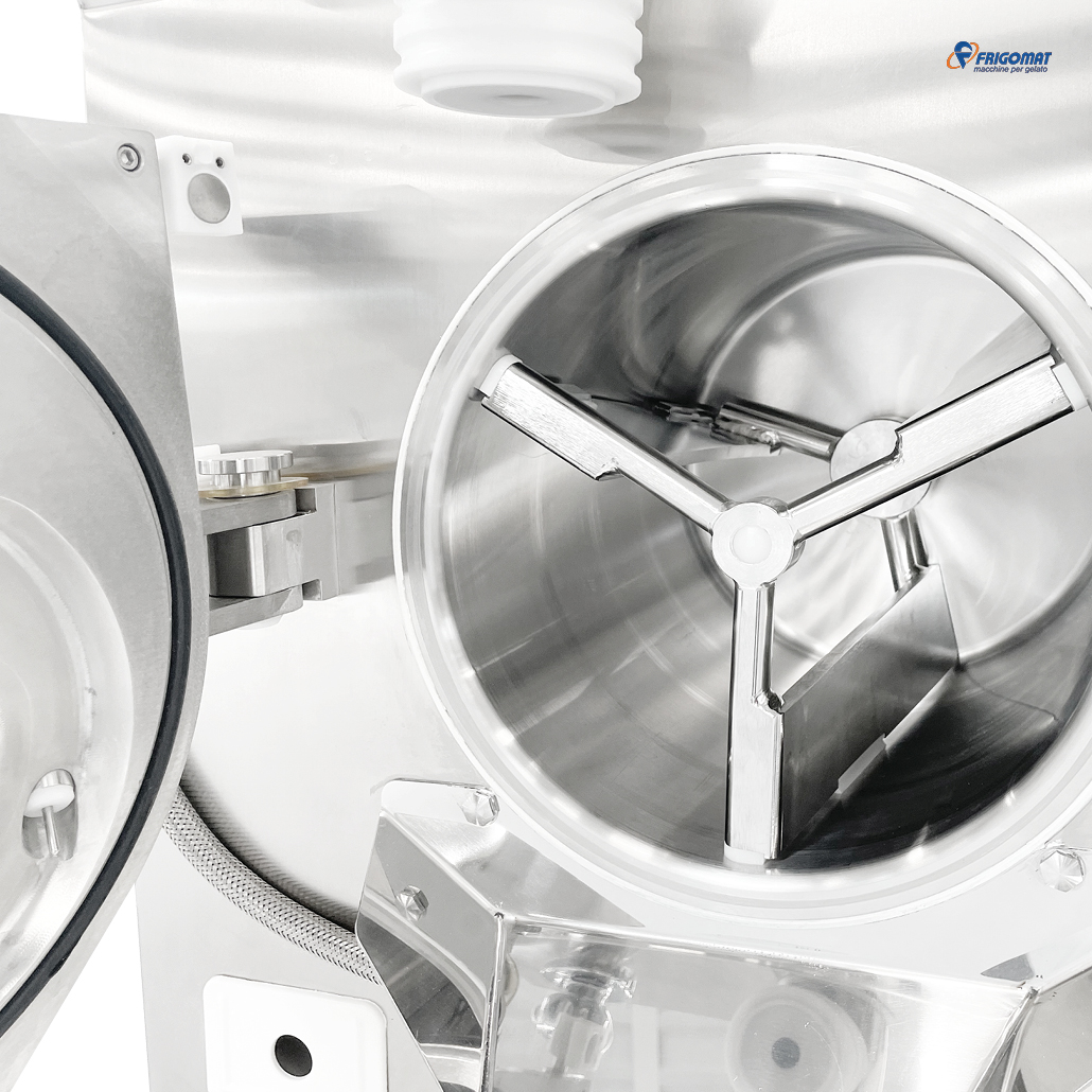 Der Kochzyklus arbeitet auf dem Glykol-Wasserbadprinzip und sorgt so für eine sanfte Temperatureinstellung. Die Zusatzoption „heikle Produkte“ verhindert, dass die Temperatur über 100 °C steigt. Der Fühler zur Becken- und Temperaturkontrolle wird dabei direkt in die Mischung eingelegt.