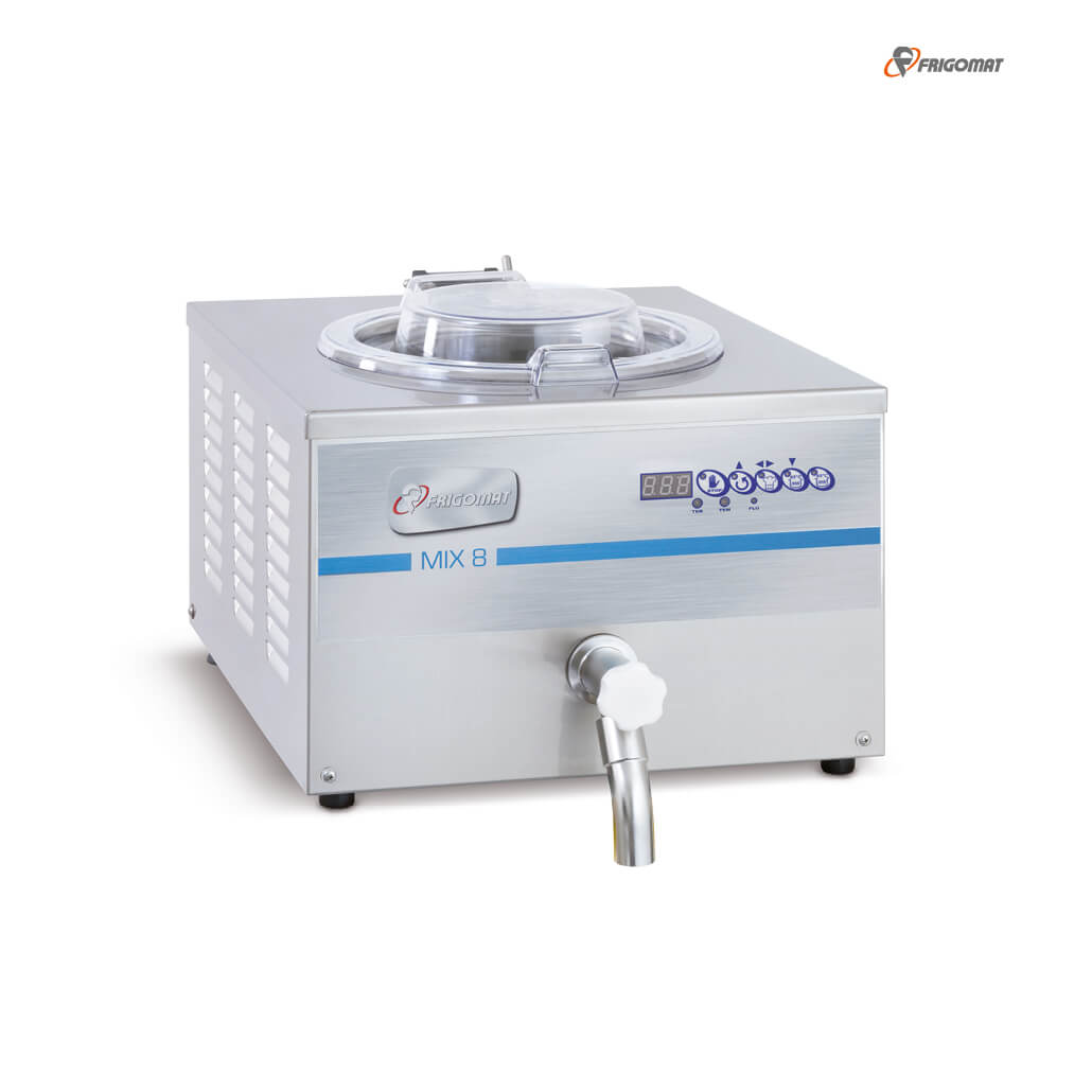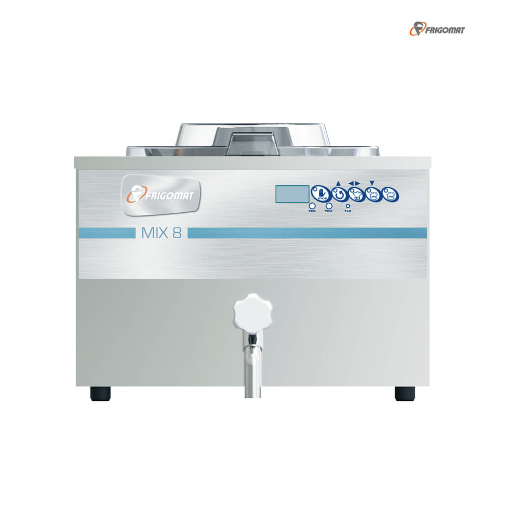 Der Frigomat Kocher MIX 8 punktet mit zwei automatischen Arbeitszyklen mit 65 °C und 85 °C und einem halbautomatischen Zyklus mit einer Temperaturauswahl von 30 °C bis 90 °C. Die Mischungsverarbeitung erfolgt mit dem Wasserbadprinzip, wodurch die optimale Qualität sichergestellt wird.