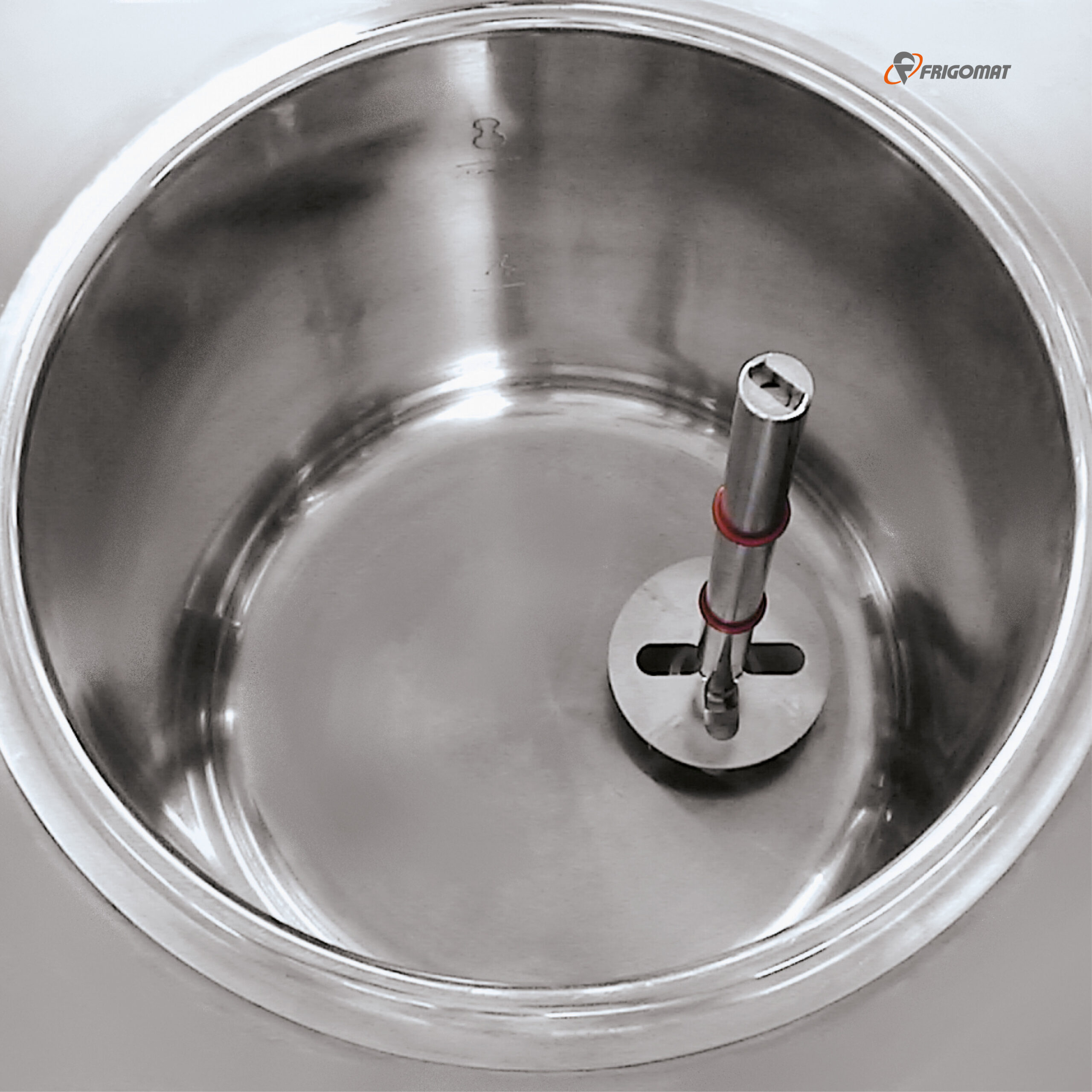 Das Becken ist aus einem Block gefertigt und hat ein Fassungsvolumen von 8 Litern. Damit das Produkt optimal gemischt und gleichmäßig erwärmt wird, arbeitet der MIX 8 mit einem exzentrisch gelegenen Rührwerk.