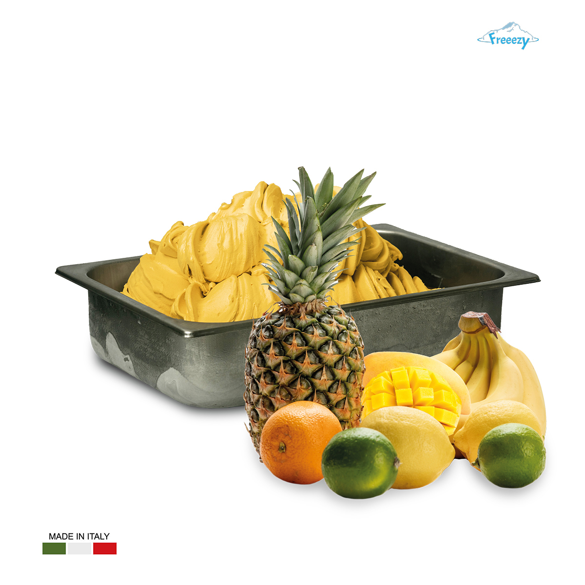 Das mit Freeezy Pronto Tropical hergestellte Eis bietet eine köstliche Kombination aus den Aromen von Mango, Ananas, Passionsfrucht und weiteren tropischen Früchten. Diese Vielfalt sorgt für ein Dessert, das nicht nur geschmacklich begeistert, sondern auch optisch durch seine leuchtenden Farben besticht.