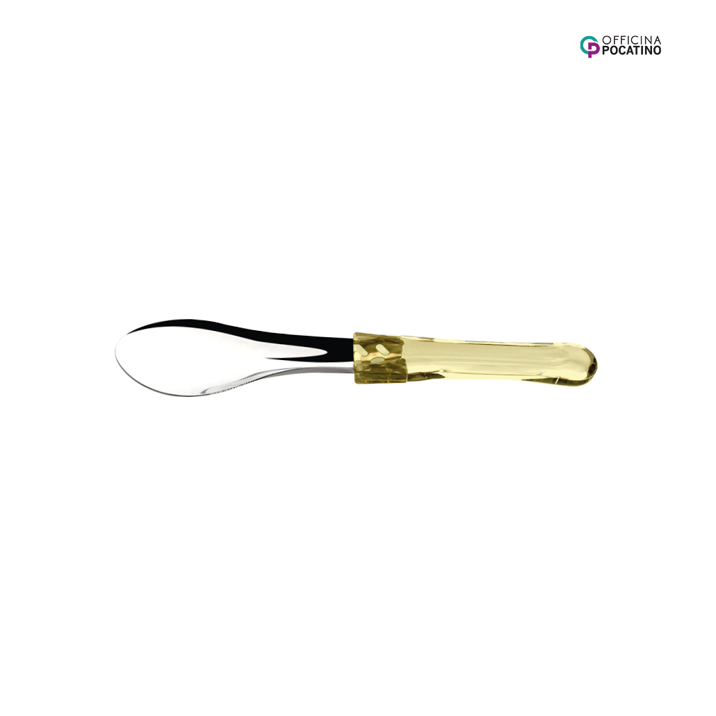 Die Pocatino Eisspachtel Kristall gelb Ø 26 cm ist ein perfektes Werkzeug für die Speiseeisproduktion und eignet sich zum Umfüllen, Portionieren und Glätten. Die Klinge zum einfachen Greifen und Schaben der Eiscreme besteht aus rostfreiem Stahl. Der leicht nach innen gebogene Griff macht die Eisspachtel besonders handlich.